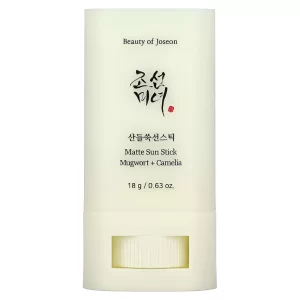 Beauty of Joseon Matte Sun Stick: Mugwort + Camellia (SPF50+ PA++++) – 18g este un stick solar compact ce contribuie la protejarea pielii de razele UV și ajută la reducerea luciului. Formulat cu extract de artemisia și ulei de camellia pentru o finisare mată și confort imediat.